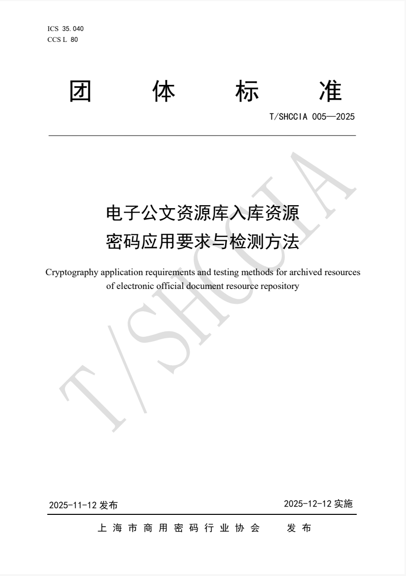 近日,由格尔软件(603232)及旗下格尔国信参与编制的《电子公文资源库入库资源密码应用要求与检测方法》(T/SHCCIA005-2025)团体标准正式发布,将于2025年12月12日起实施。该标准标志着我国电子公文资源库安全建设迈向标准化、规范化新阶段。