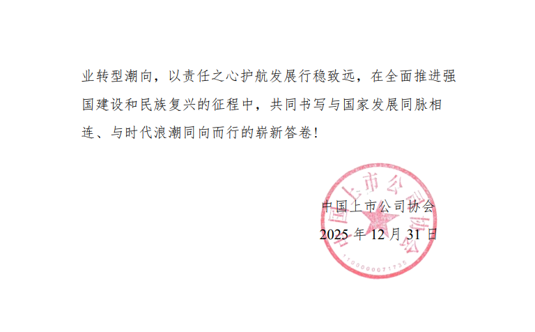 值此辞旧迎新之际,中国上市公司协会向国网信息通信股份有限公司(简称”公司“)发来新年的祝福,感谢公司一直以来对中国上市公司协会工作的信任与支持,并愿意在新的一年携手会员单位坚守初心、勇担使命,以治理之基筑牢市场信任长城,以创新之帜引领产业转型潮向,以责任之心护航发展行稳致远,在全面推进强国建设和民族复兴的征程中,共同书写与国家发展同脉相连、与时代浪潮同向而行的崭新答卷!