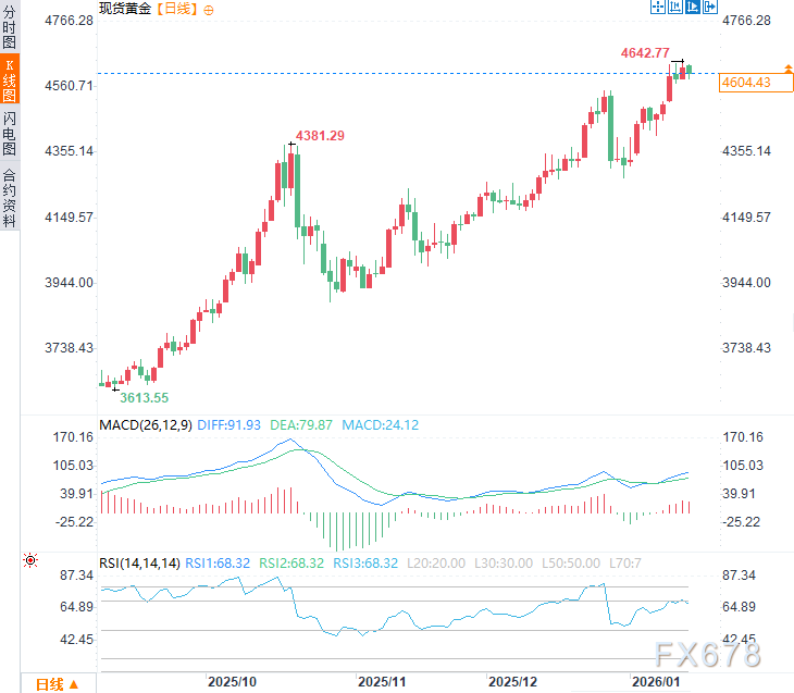 美国总统唐纳德·特朗普断言,阻碍潜在和平协议达成的主要是乌克兰,而非俄罗斯。与欧洲盟友的立场截然不同,特朗普暗示莫斯科已准备好结束冲突,而基辅方面却仍持犹豫态度。短期看,特朗普立场变动降低了冲突升级风险,对黄金构成利空。周四(1月15日)亚市时段,现货黄金震荡下行,一度下跌0.92%至4583美元/盎司,但仍有逢低买盘提供支撑,目前回升至4610美元附近,日内跌幅约0.3%。